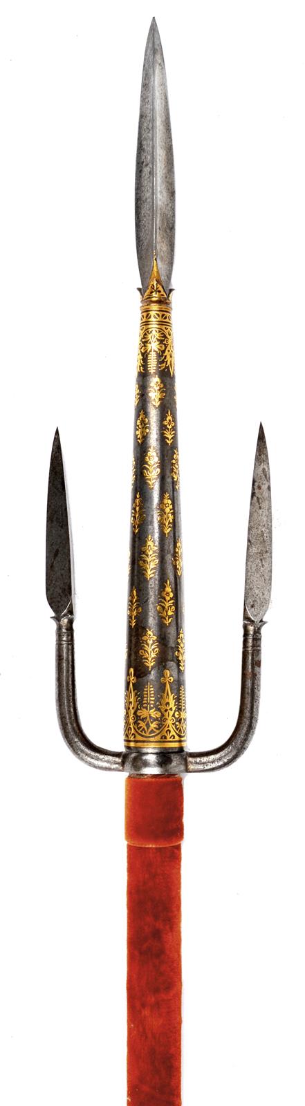 An Indian trident, the steel head being that of a cavalry lance, hollow triangular section point with three petals formed at the base, the socket finely decorated with flowers and swags in gold koftgari, two further points projecting from a ring held on the shaft below the main socket, steel shaft clad in red velvet, length 150 cm (59 in.), late 19th or 20th Century, possibly part of the armoury of one of the Princely States.