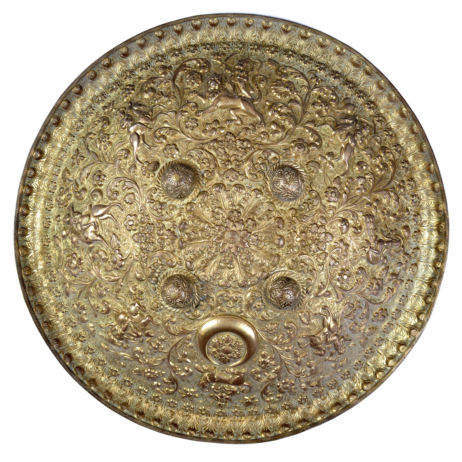 A fine Indian shield, gilt brass and of characteristic circular form with four bosses and an everted rim, rich repousse decoration of plumes and foliage inhabited by figures of Hindu deities mounted on their vanaha, including Durgha riding a lion, Kartikeya on a peacock, and Ganesha on the giant mouse Mushika, twin handles and knuckle pad covered with green velvet, diameter 53 cm (21 inches)