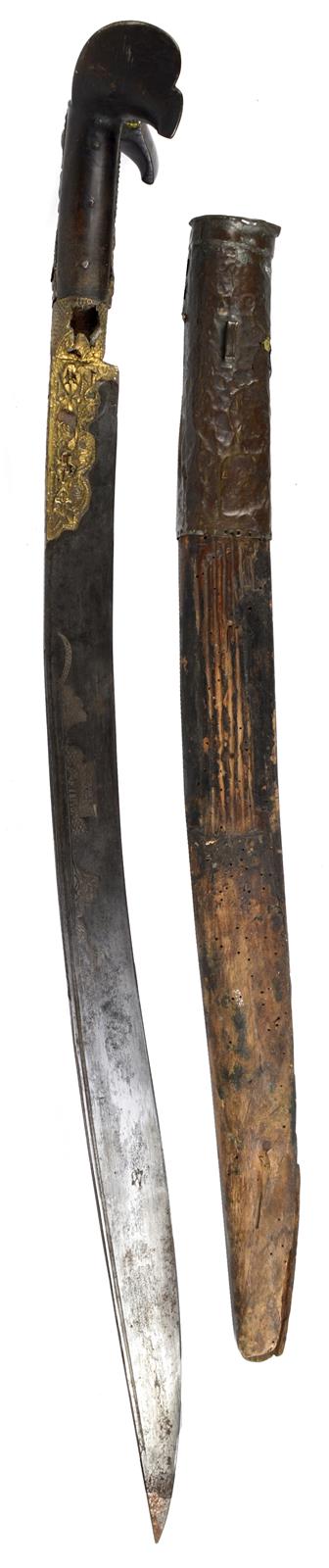 A Turkish sword (yataghan), characteristic forward curving blade 23.5 in. with narrow back fuller, discrete koftgari type decoration of a roundel to one side and a scrolling panel involving Arabic text to the other, rhino horn hilt with large flaring terminal, brass repousse embellishment covering the grip frame and forming a collar that extends over part of the blade, part scabbard comprising wooden liner and copper locket, 19th Century.