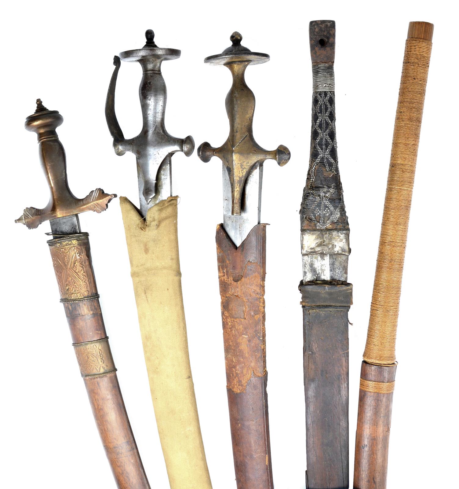 An Omani sword, of characteristic form with spatulate blade 31.5 in., guardless hilt with tapering grip and oblong iron pommel, scabbard with embossed leather cladding and white metal chape; together with a Burmese sword (dha), blade 22.5 in. and with gilt decoration of animals and soldiers (including one in Western uniform - possibly a Japanese), rattan bound hilt and scabbard; two tulwars, of conventional form with steel hilts and wood lined scabbards; and another Indian sword, bi-fullered blade 25.5 in., copper hilt with leaf terminal quillons and swollen grip, wooden scabbard with copper repousse mounts. [5]