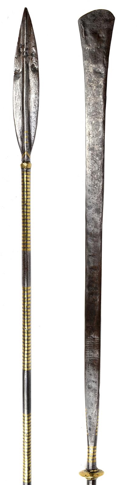 A good Tuareg all metal lance, leaf shaped point with pronounced medial ridge, steel shaft decorated with bands of brass arranged in discreet phases, brass thumb stop, flattened and flaring butt, length 191 cm (75 in.)