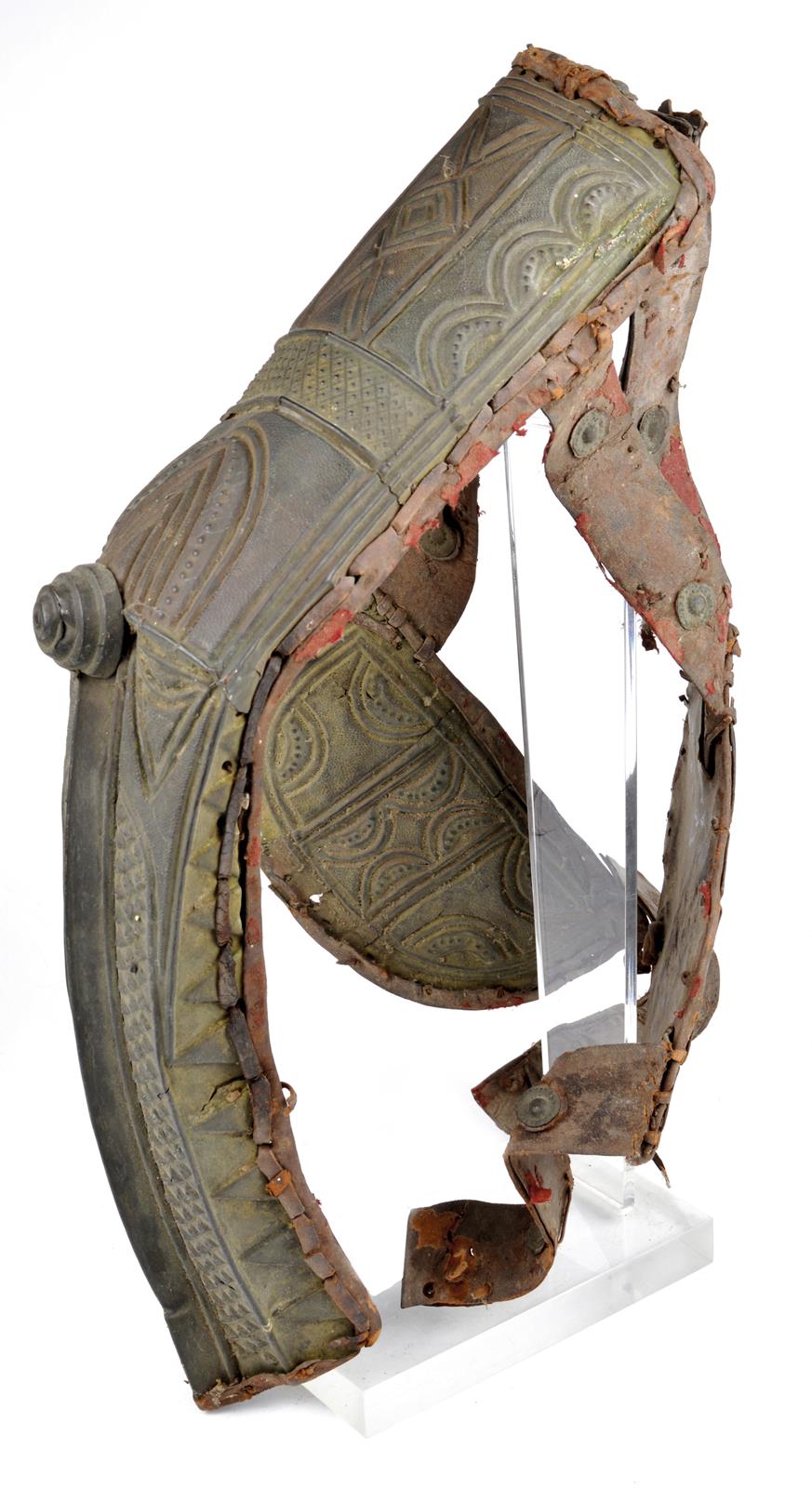 A Sudanese chanfron, formed of embossed brass plates lined with leather and united by leather straps, possibly for a camel (see Stone pp 170-171); together with a small collection of eastern knives and daggers. [10]