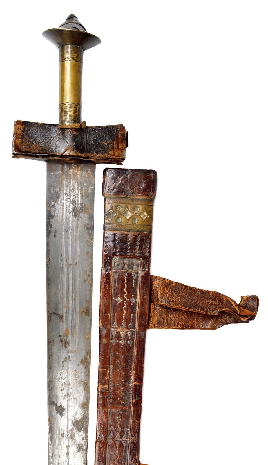 A Tuareg sword (takouba), broad double edged blade 31 in., rectangular guard with leather cover, brass grip and pommel, moulded leather scabbard.