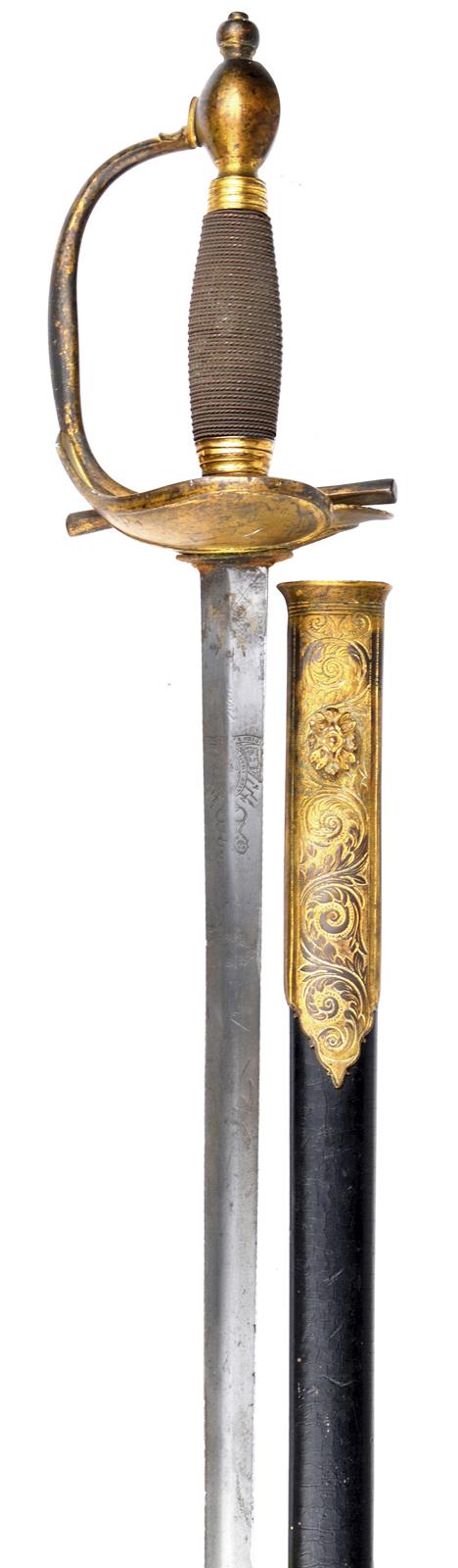 A British heavy cavalry officer's dress sword, c. 1796, slender double edged blade 30.5 in., with etched details including GR cypher retaining traces of gilding, 1796 pattern gilt brass hilt with boatshell guard and knuckle bow, associated gilt brass mounted black leather scabbard, the locket and chape engraved with foliate scrolls, ornate frog stud.