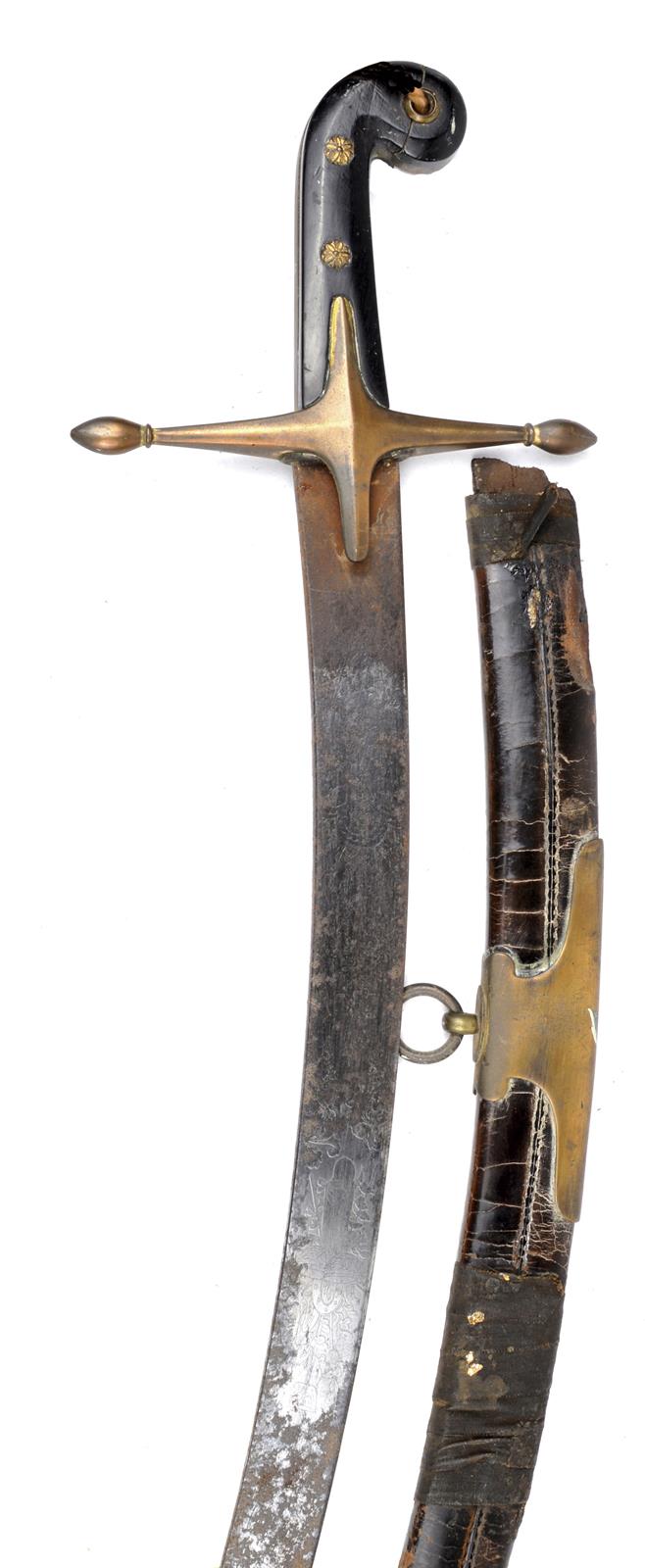 An early 19th Century British officer's sword of light cavalry dress type, by Hebbert and Humes, curved clip-point blade 28.25 in., with etched decoration including: 'HEBBERT & HUMES WARRANTED', 'mameluke' hilt with plain guard retaining traces of gilding, horn grips (some loss), gilt brass mounted leather scabbard (lacks locket).