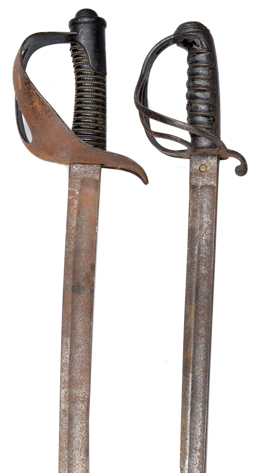 A British Artillery officer's sword, steel three bar hilt,; together with an Italian model 1860 cavalry trooper's sword, each lacking scabbard. [2]