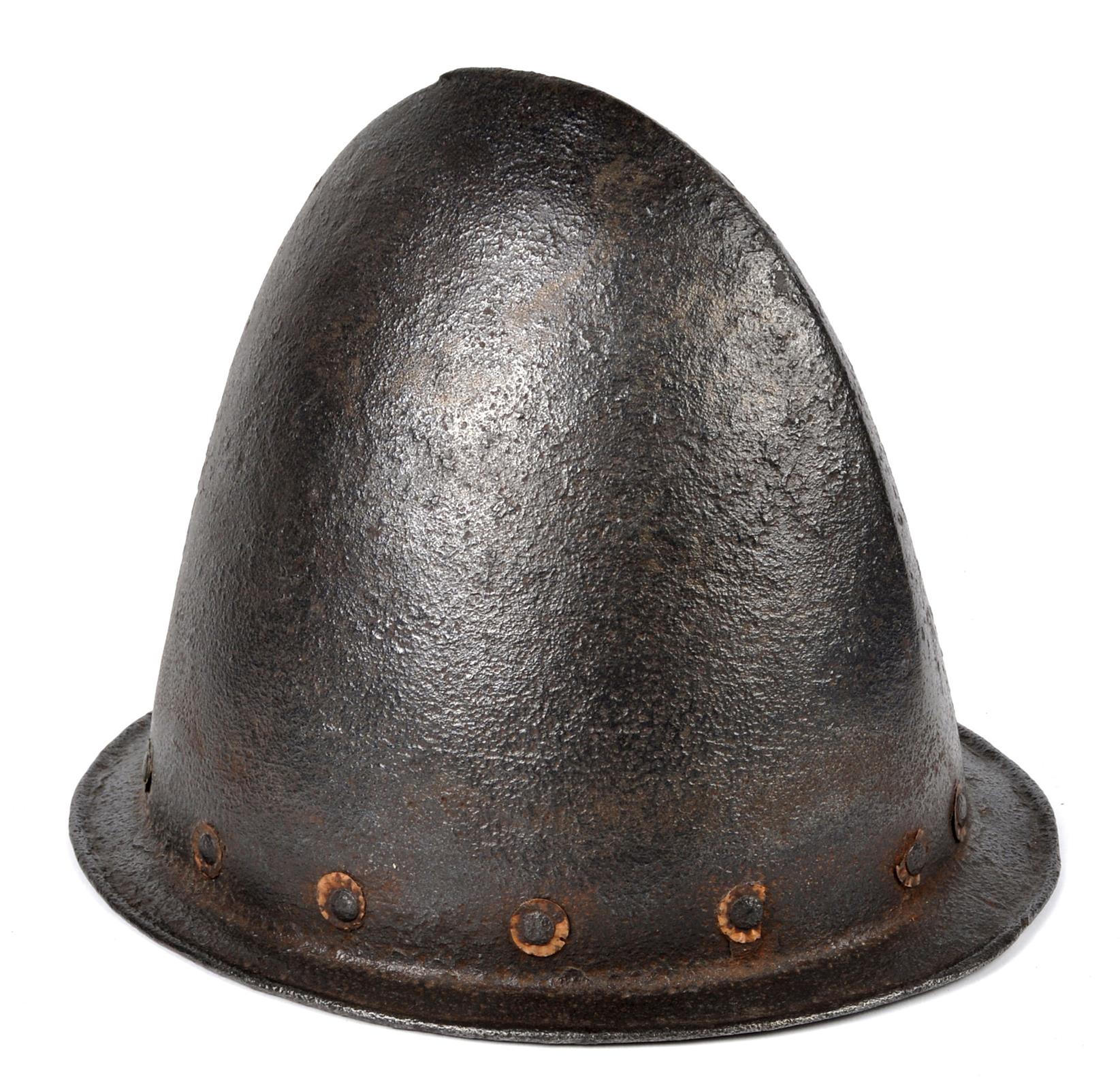 An Italian helmet (cabasset), in the 17th Century style, high skull with diminutive 'stalk', the base set with rivets and rosette washers, the narrow brim struck with indistinct armourer's mark.