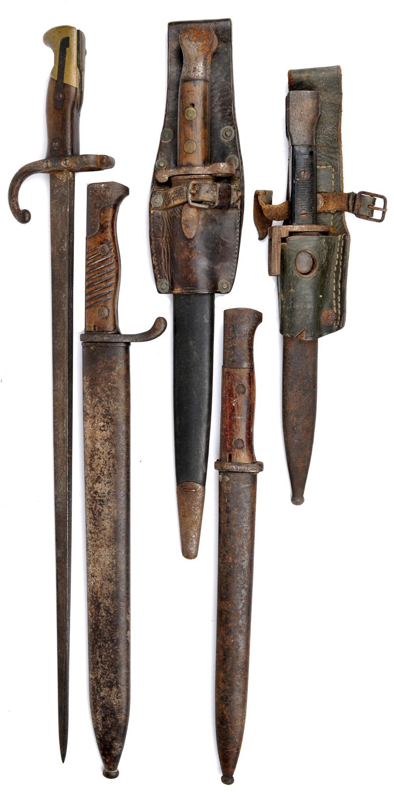 A small collection of bayonets, comprising: British 1888 pattern, Mk I 2nd type, leather scabbard and frog; German model 98/05, sawback, by Alex Coppel, steel scabbard; German M 84/98 II, by Herder, hilt marked 'STA B. 701. 6.', steel scabbard; Belgian FAL type A, lacking mounting catch, steel scabbard and leather frog; French model 1874, lacking scabbard. [5]