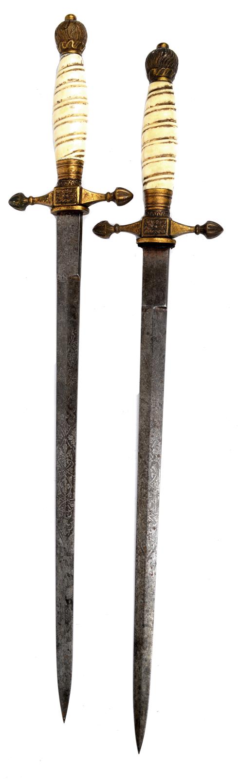 Two Imperial German naval dress daggers, etched blades 13.5 in., gilt brass cross guards and pommels, the latter with wheat ears in relief, barley twist ivory grips, lacking scabbard.[2]