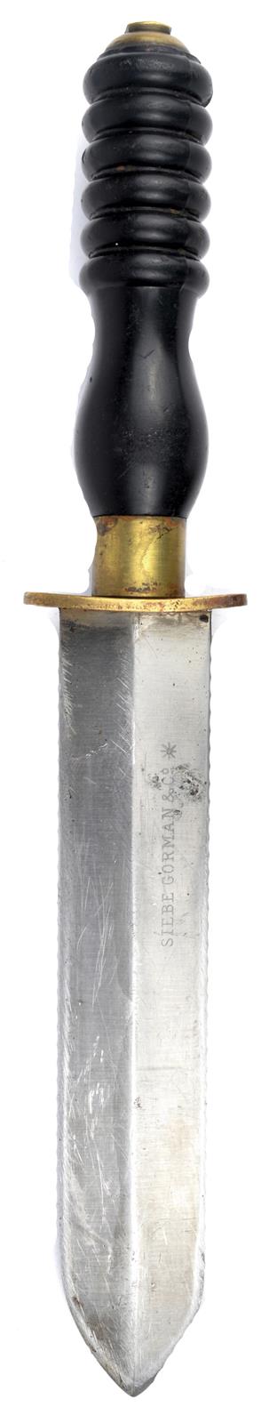 A Diver's knife, by Seibe Gorman, heavy double edged blade 7.5 in., brass guard and ferule, composition grip of ribbed baluster form, lacks scabbard.