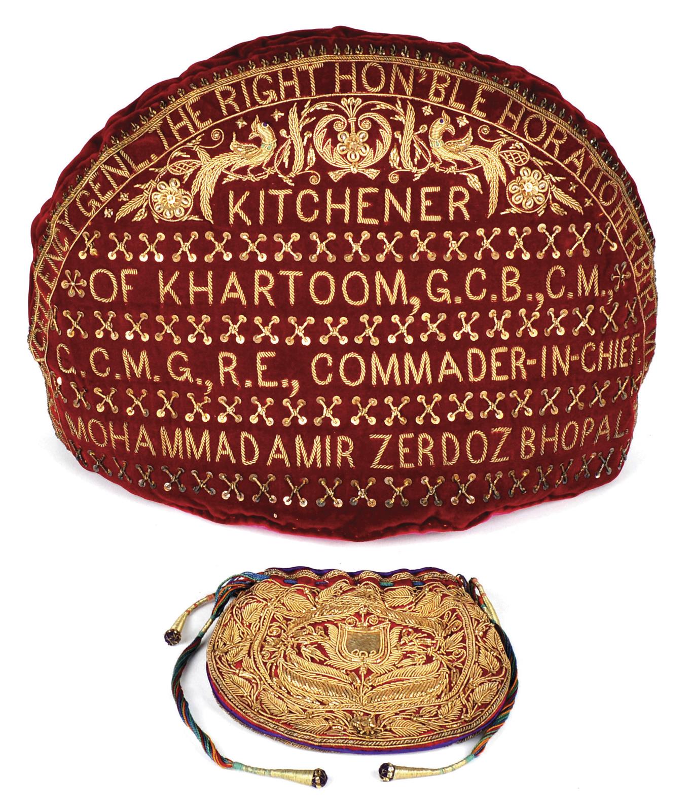 General Herbert Horatio Kitchener, Viscount Kitchener of Khartoum: a splendid Indian zardozi work presentation tea cosy, of scarlet velvet, heavily adorned in gilt thread and sequins with the title and arms of Her Highness the Nawab Sultan Jahan Begum of Bhopal, the other side with the names and titles of Kitchener as Commander in Chief India; together with a zardozi work three division purse.