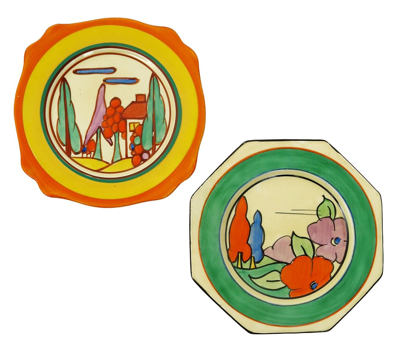 'Poplar' a Clarice Cliff Bizarre side plate, octagonal form, painted in colours inside a green band, and a Clarice Cliff Seven Colour Secrets side plate, printed factory marks, professional restoration to rims, 14.5cm. diam. (2)