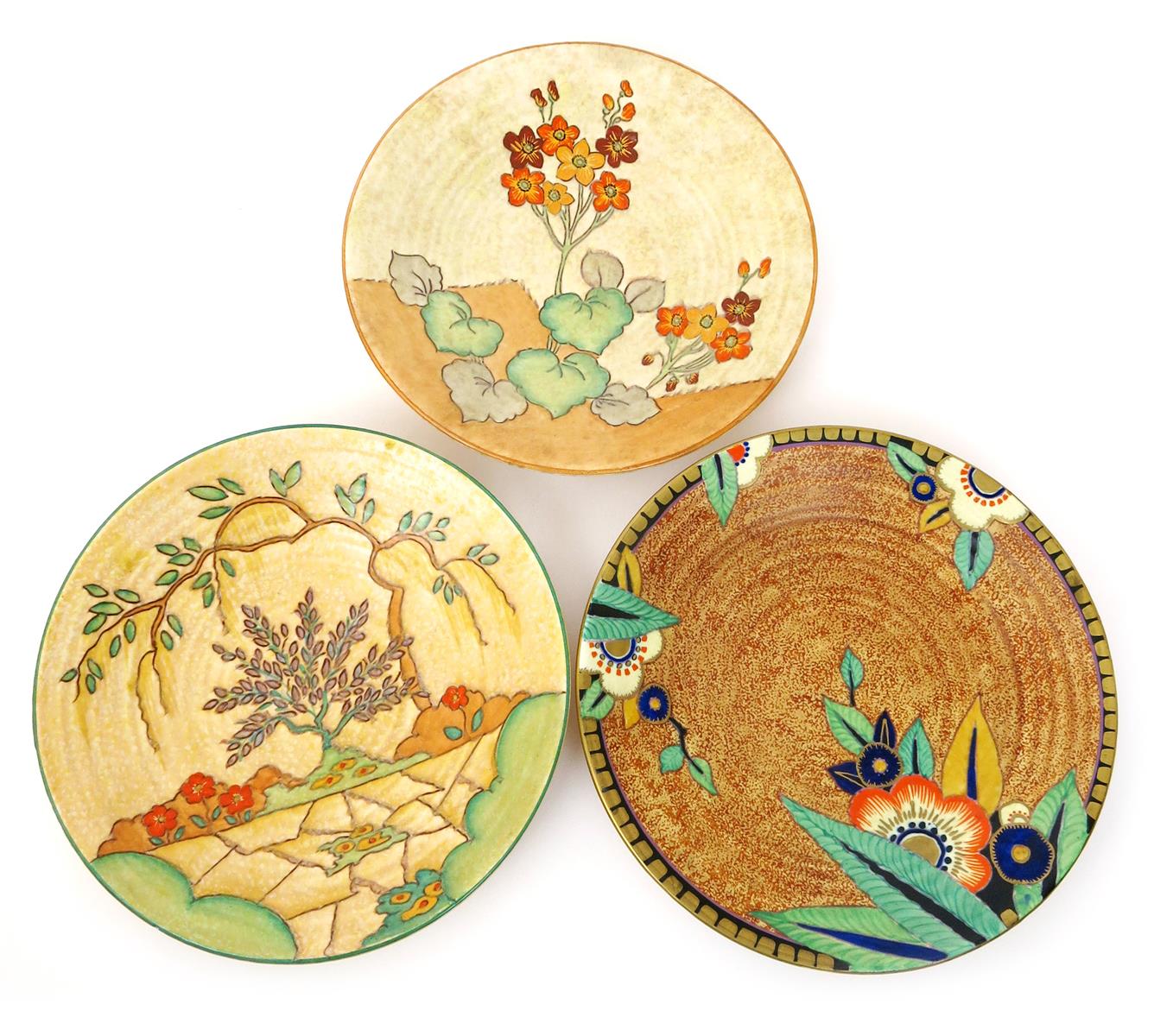 An Art Deco Crown Devon wall plaque, model M.35, printed and painted in colours and gilt on a mottled orange ground with stylised flowers and foliage, two other Crown Devon wall plaques and a single lhandled vase printed and painted marks, hairline to rim of one, 30.5cm. diam. (4)