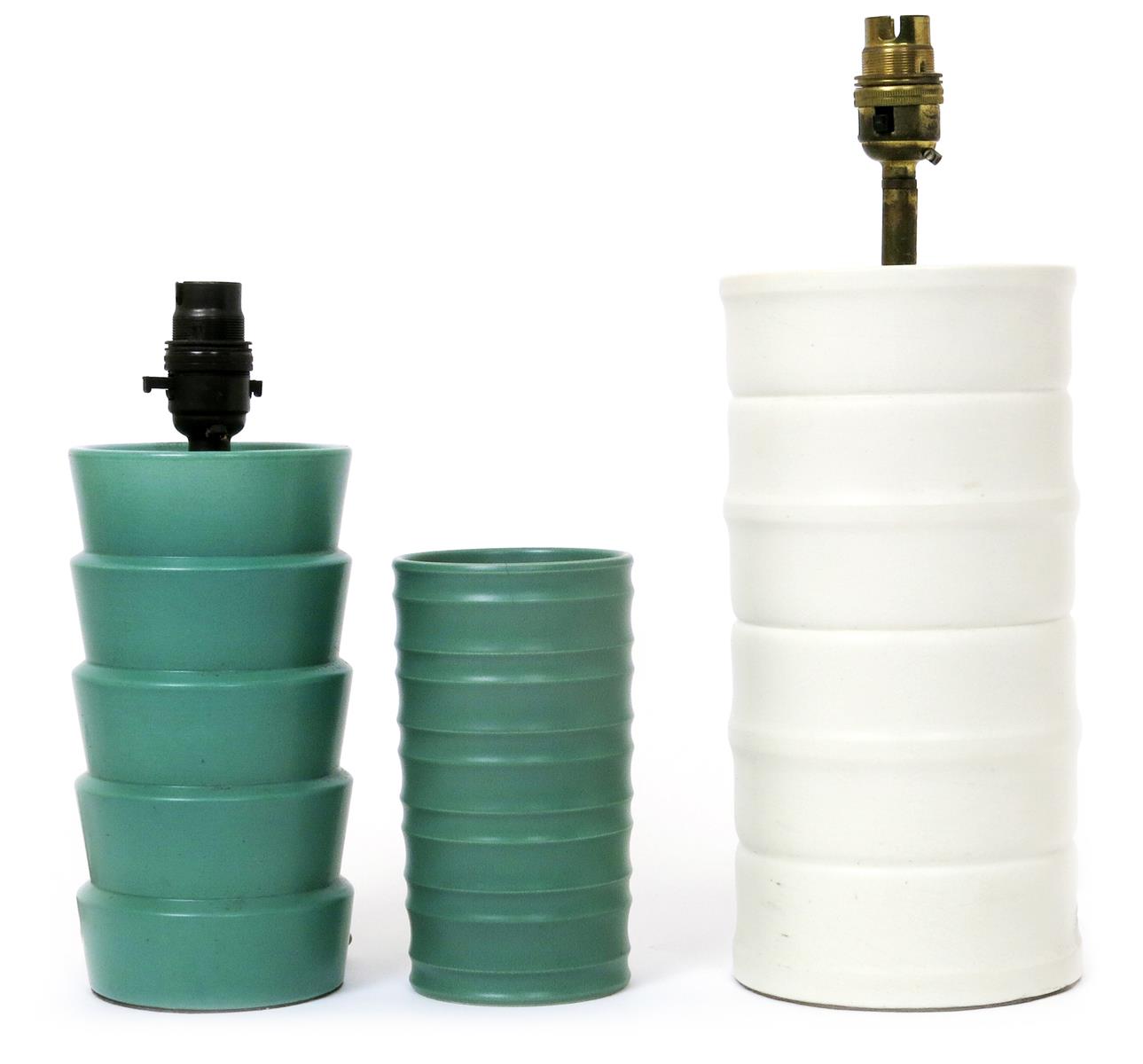 A Wedgwood Pottery vase designed by Keith Murray, model no.4318, ribbed cylindrical form, covered in a matt green glaze, and two Wedgwood Pottery table lamps designed by Keith Murray, printed factory marks, KM monogram, hairline to top rim of vase, 16cm. high, (3)