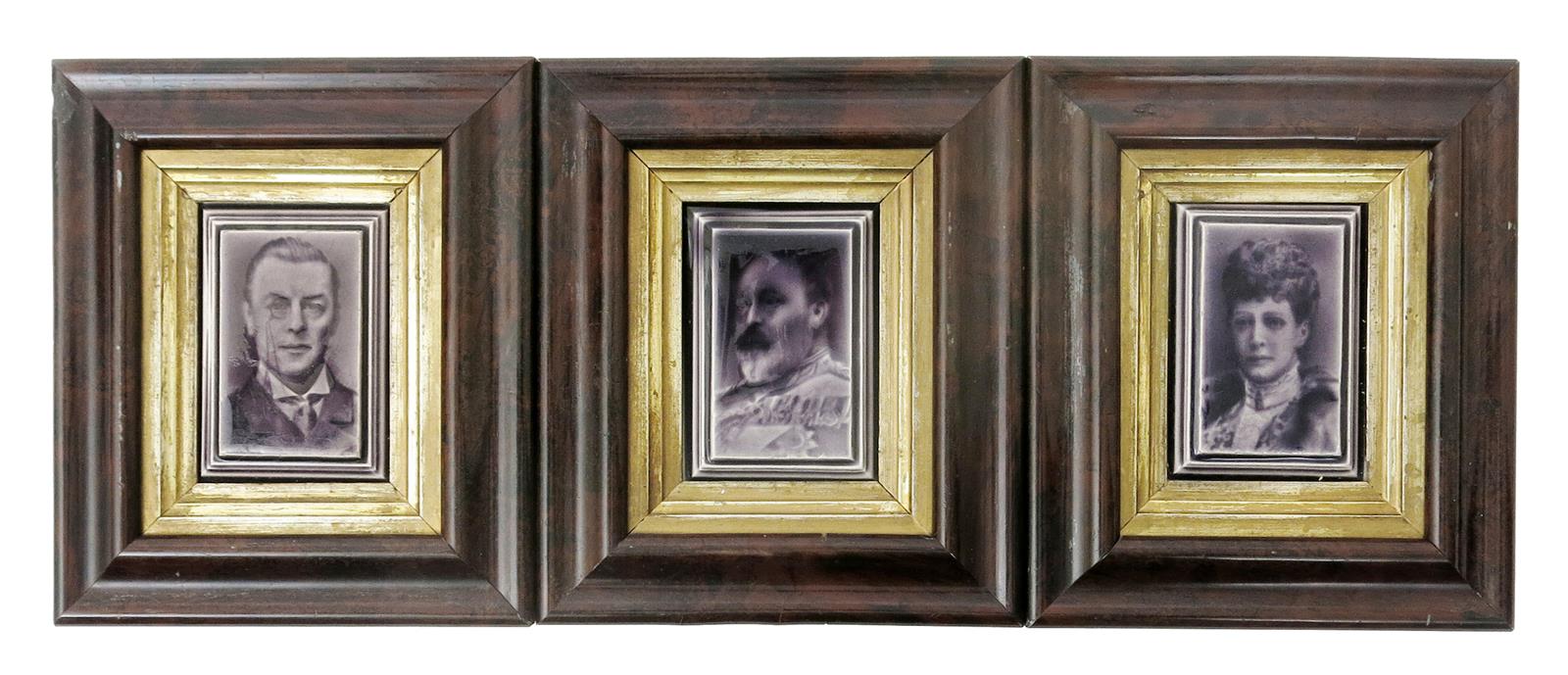 King Edward VII, Queen Alexandra, and Joseph Chamberlain Three Craven Dunnill & Co portrait tiles, each covered in a purple monochrome glaze, frame impressed marks, 10.5 x 7.5cm. square, (3)