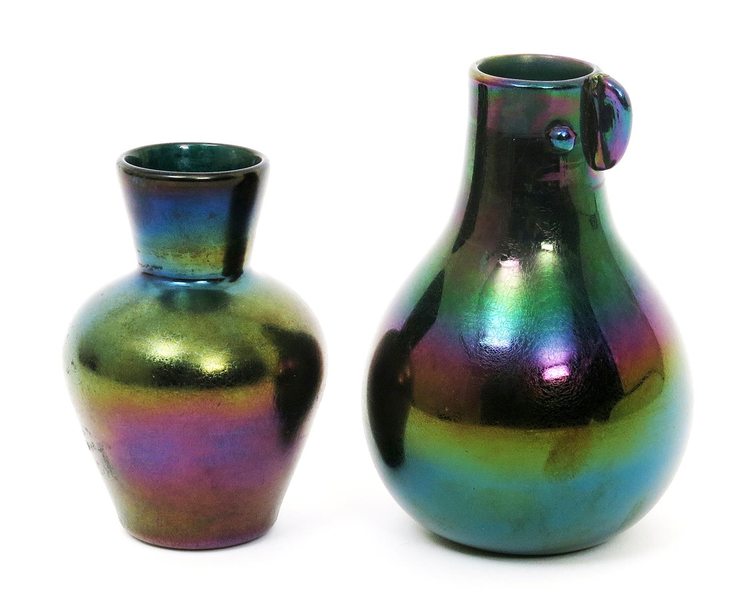 A Webb Bronze vase the design attributed to Dr Christopher Dresser, ovoid with cylindrical neck, applied with a stylised glass face, with iridescent finish, and another Webb Bronze vase unsigned 13.5cm. high (2)