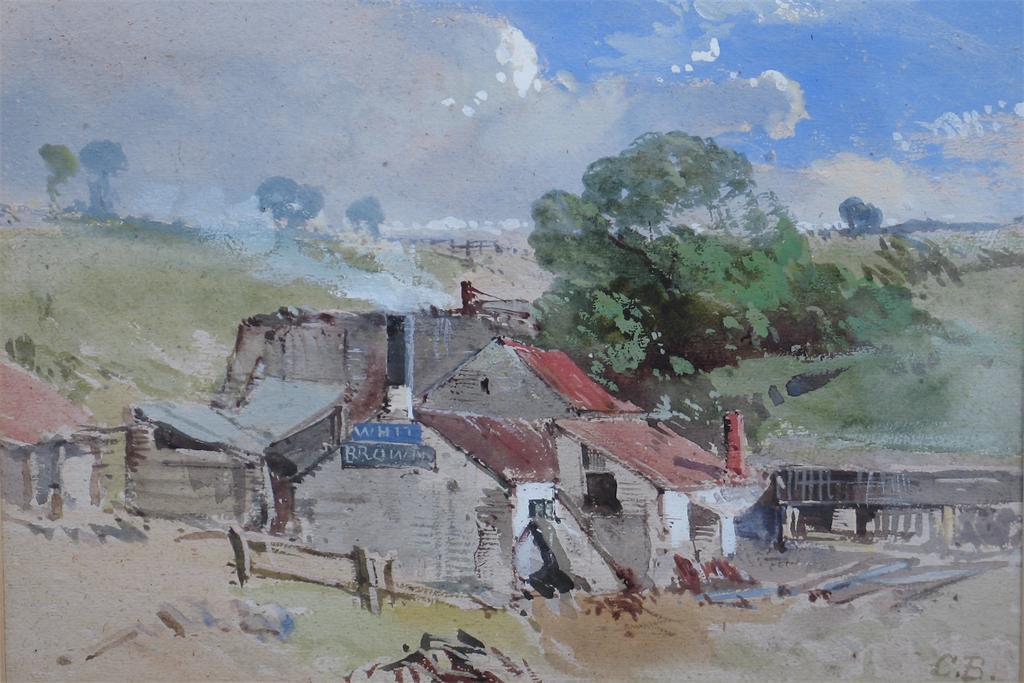 ATTRIBUTED TO CHARLES BRANWHITE (fl.1873-1899): Farm buildings, signed with intials, watercolour, 24 x 34cm (9.5 x 13.5in)