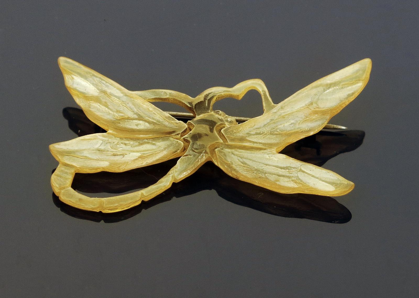 An Art Nouveau horn brooch by Gip, carved with a dragonfly, with some staining, signed Gip 6.5cm. wide