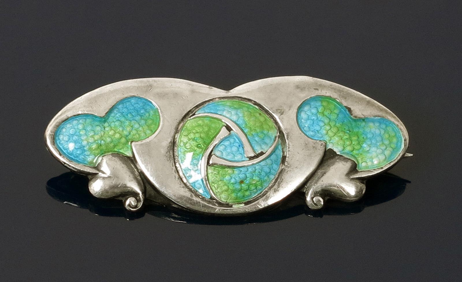 An Art Nouveau silver and enamel bar brooch, cast in low relief with heart-shaped foliage and central roundel, enamelled turquoise and green indistinct stamped marks, 3.5cm. wide