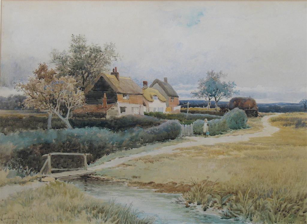 LEOPOLD RIVERS (1852-1905): A river landscape with cottages