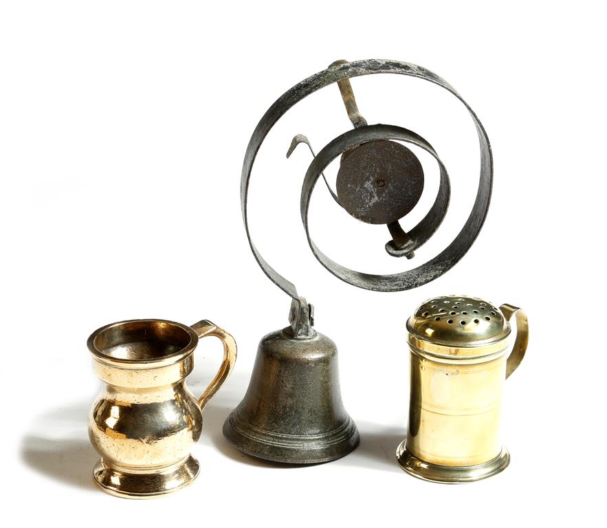 A bronze baluster gill measure, stamped 'GILL' with 'VR crowned' stamp, a brass kitchen shaker and a servant's bell with fixings, 23cm high (max). (A lot)