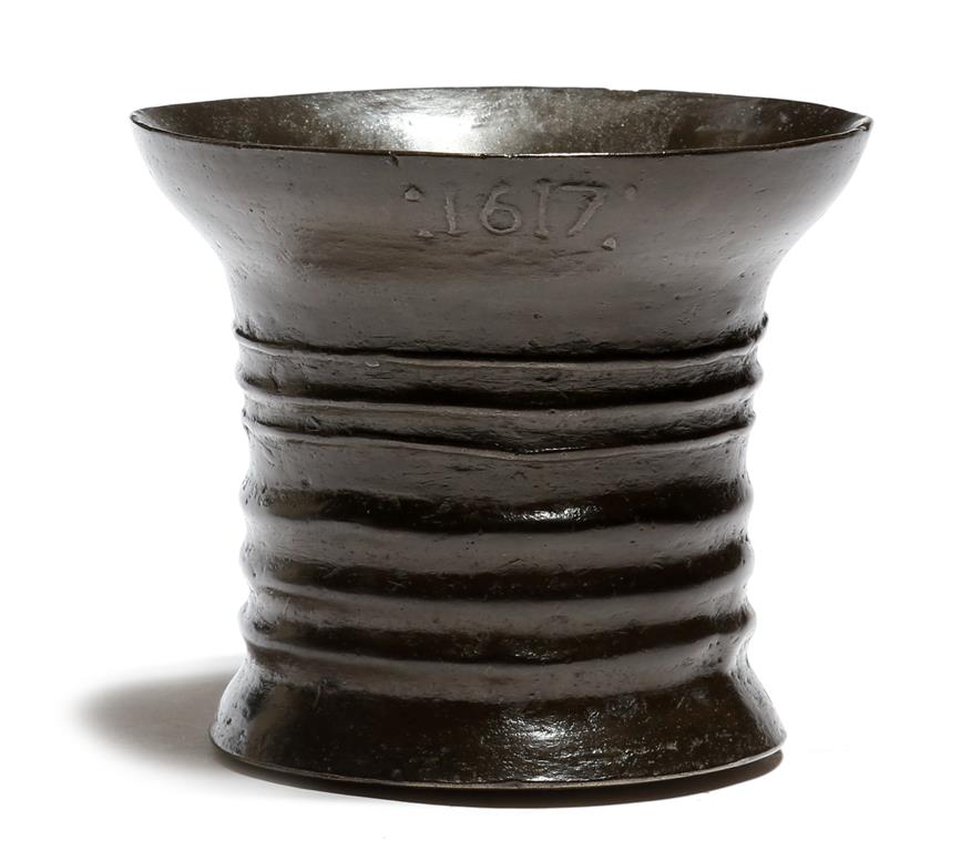 A James I dated bronze mortar, the body decorated with reeded bands and dated '1617', the proportions point possibly to the Oldfield family of Nottingham, 10.9cm high, 12.6cm diameter.