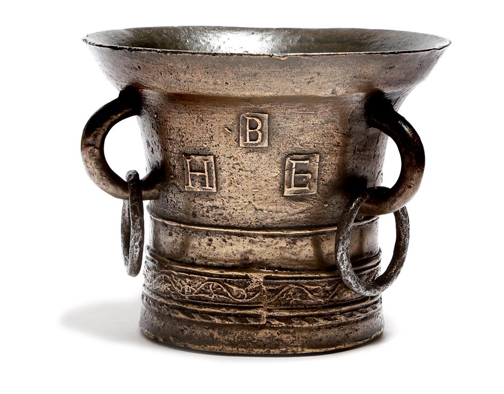 A large 17th century bronze mortar attributed to George Oldfield I of Nottingham, with three lug handles with wrought iron rings, the body cast panels of foliage and with ownership triad initials, 'H B E', with a band of scrolling foliage, 17.5cm high, 21.5cm diameter.