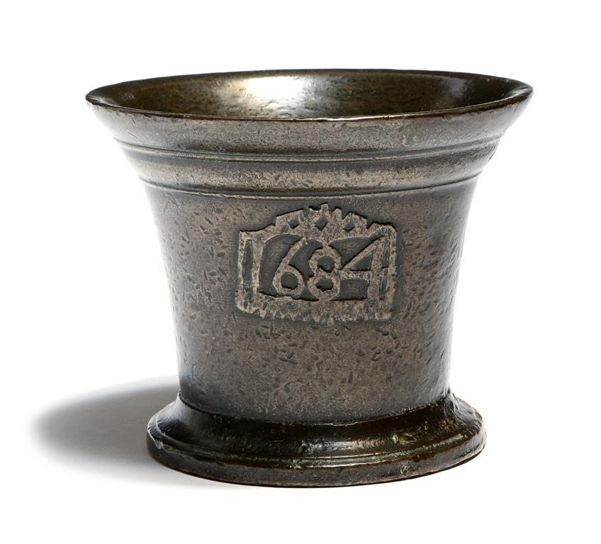 A Charles II dated bronze mortar, the body cast with the owner's triad 'E R A', with a heart stop and dated '1684', possibly by the Francis Sturton / 'Cut-Card' Foundry of South Petherton, 14cm high, 17.2cm diameter.