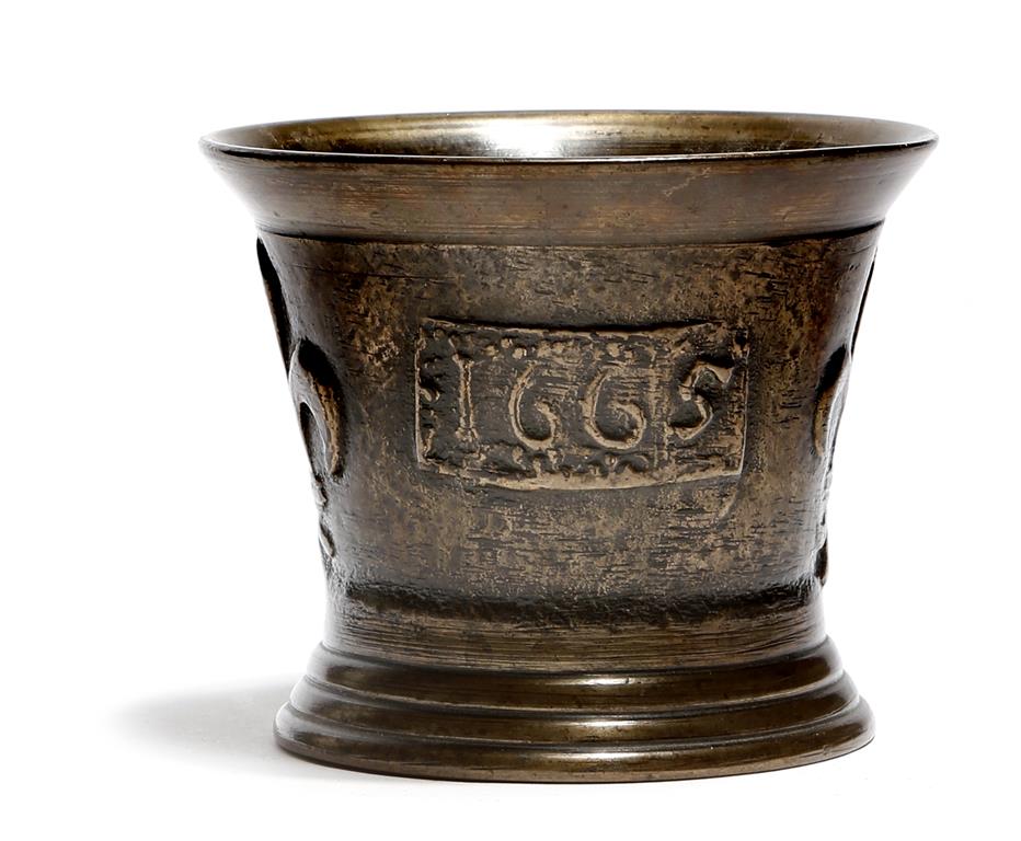 A Charles II dated bronze mortar attributed to Francis Foster of Salisbury, the body cast with a fleur-de-lis motif, a band of grape vine and the date '1665', the base with five concentric rings, 9.5cm high, 11.5cm diameter.