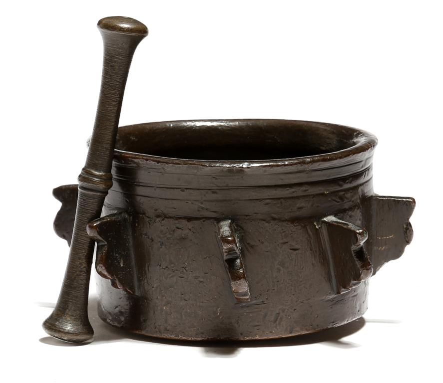 A 15th century Iberian bronze mortar, with eight shaped projecting lugs, with incised bands, together with an associated turned pestle, 14cm wide. (2)