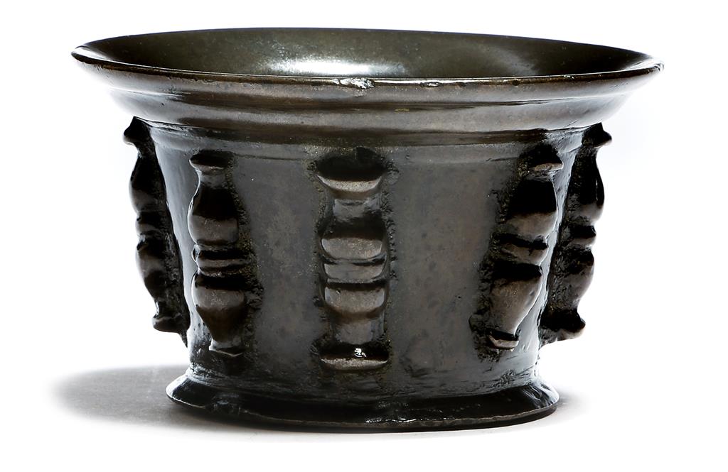 A 17th century Iberian bronze mortar, the body decorated with split balusters, 8.1cm high, 13.3cm diameter.