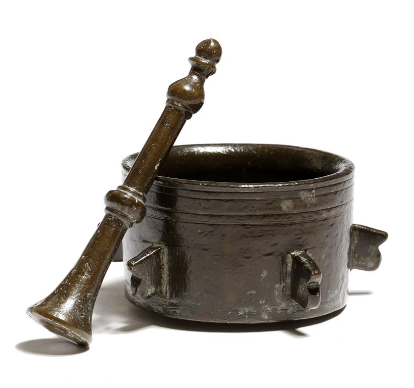 A 15th century Iberian bronze mortar, with five projecting 'V' shaped lugs and incised bands, together with a possibly original turned pestle, 13cm wide. (2)