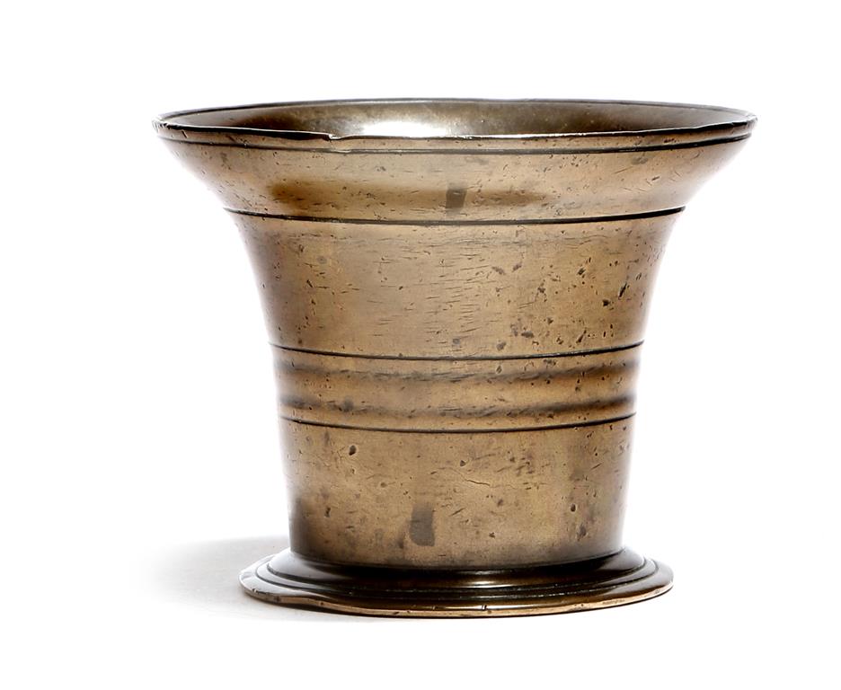 An 18th century bronze mortar, the body with incised lines, the base with a maker's stamp initials 'C A', 9.3cm high, 12cm diameter.