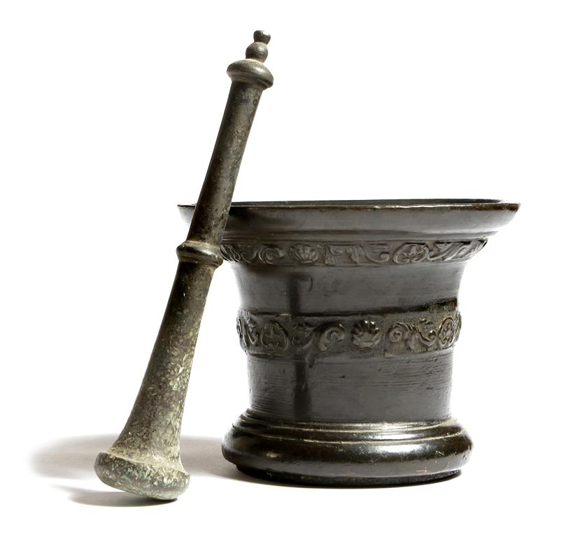 A 17th century bronze mortar attributed to the Whitechapel Foundry in London, decorated with two bands of scrolling foliage and shells, together with an associated pestle, 14.4cm high, 18.1cm diameter.