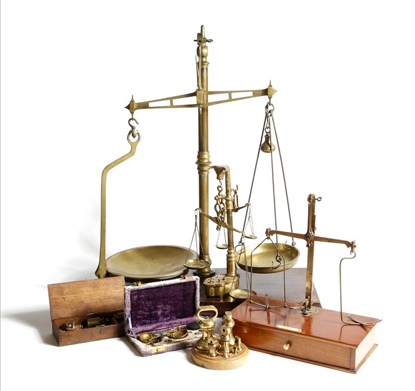 A collection of balance scales, comprising: a brass set with a mahogany box base by D.E. Grave Short & Co. Ltd., a set by W & T Avery Ltd with seven weights, an unusual scales with a bull's head terminal and five weights and two other cased sets, 66.7cm high (max). (5)