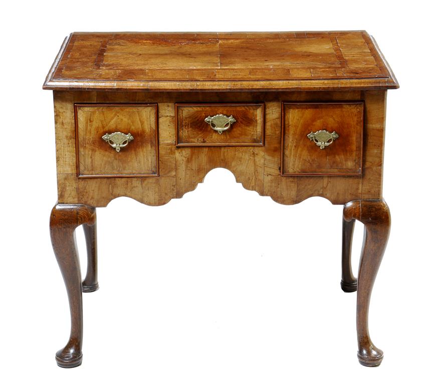A George II walnut lowboy, the quarter veneered and crossbanded top with a moulded edge, above three frieze drawers and on oak cabriole legs and pad feet, 71.7cm high, 81.3cm wide, 53.5cm deep.