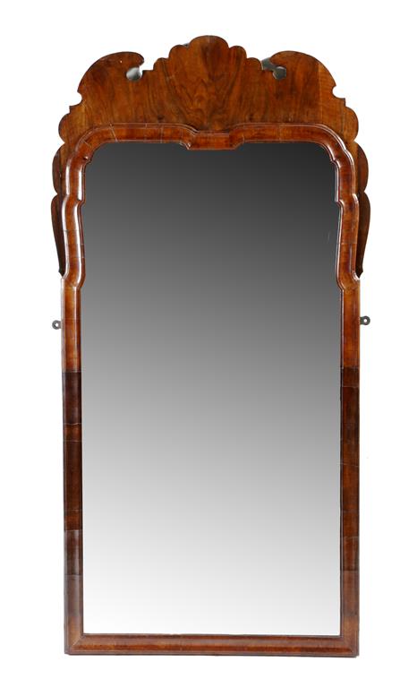 A George II walnut fret-frame wall mirror, with a shaped bevelled edge plate, within a moulded frame and with a detachable fret carved surmount, the reverse with a paper label for 'Paul Smith Antiques, Ludlow', 125.9 x 64.7cm.