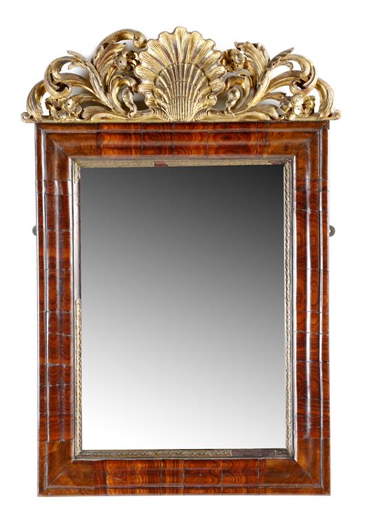 A walnut wall mirror, the bevelled rectangular plate within a gilt slip and a moulded frame, with a giltwood surmount carved with shells and leaf scrolls, 66.3 x 45.2cm.