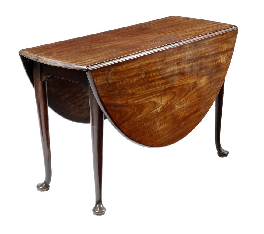 A George II mahogany drop-leaf dining table, the oval top on turned club legs and pad feet, 71.5cm high, 116 x 138cm (open).