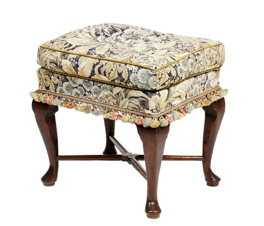A George II oak stool, the later floral upholstered seat with a tasseled fringe on cabriole legs united by an "X" stretcher, 55.5cm high, 56cm wide, 48cm deep.