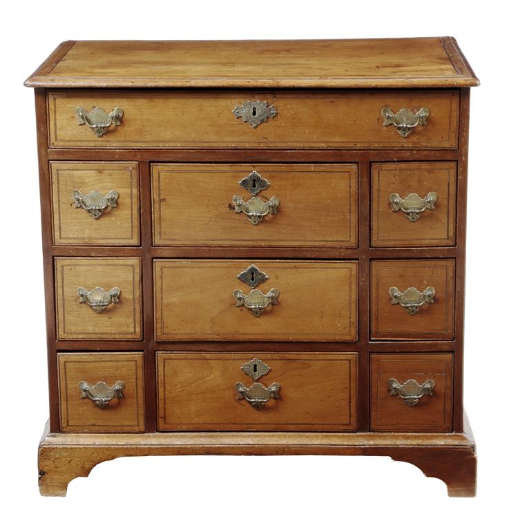 A mid 18th century mahogany chest, inlaid with stringing and fitted with an arrangement of ten drawers, 77.3cm high, 78.8cm wide, 49.3cm deep.