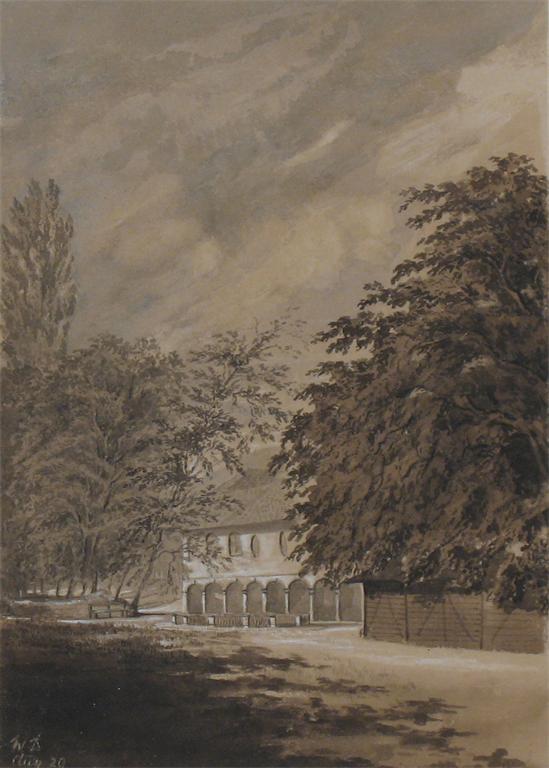 W.D.: A house, possibly in India, with mountains beyond, signed with initials and dated August 29th 18, pen and ink and grey wash heightened white, 27 x 18.5cm (10.25 x 7.25in) ++ Good condition.