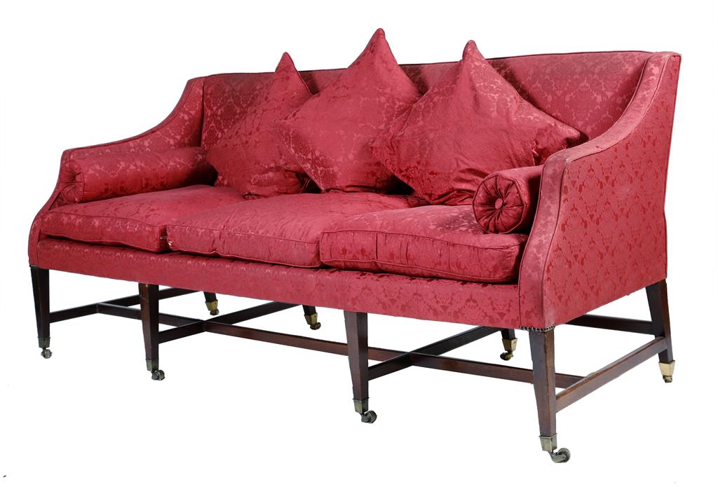 A 19th century mahogany three seater settee, covered in scarlet silk damask with six cushions and two bolsters, on stretchered square tapering legs and brass caps and castors, 92.5cm high, 200cm wide, 69cm deep.