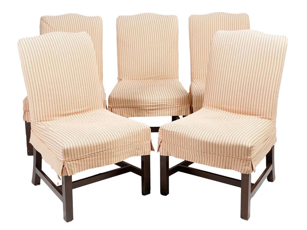 A set of five mahogany dining chairs in George III style, each with an upholstered padded back and seat, on chamfered legs united by stretchers. (5)