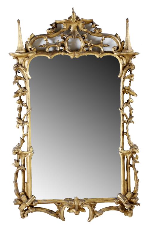 A George III giltwood wall mirror, the later plate within a naturalistically carved frame with branches, leaves and fruit, with scrolls, rockwork and finials, 116.1 x 70.5cm.