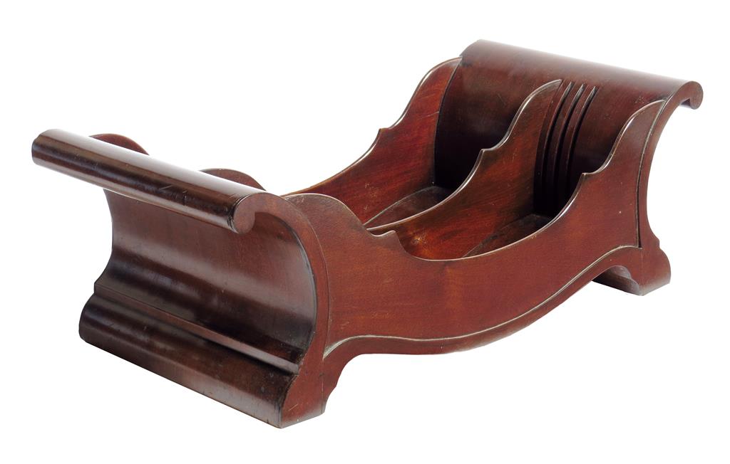 A George III mahogany cheese coaster, of panelled scroll form and with an adjustable division on sunken brass roller castors, 16.8cm high, 48cm wide, 23cm deep.