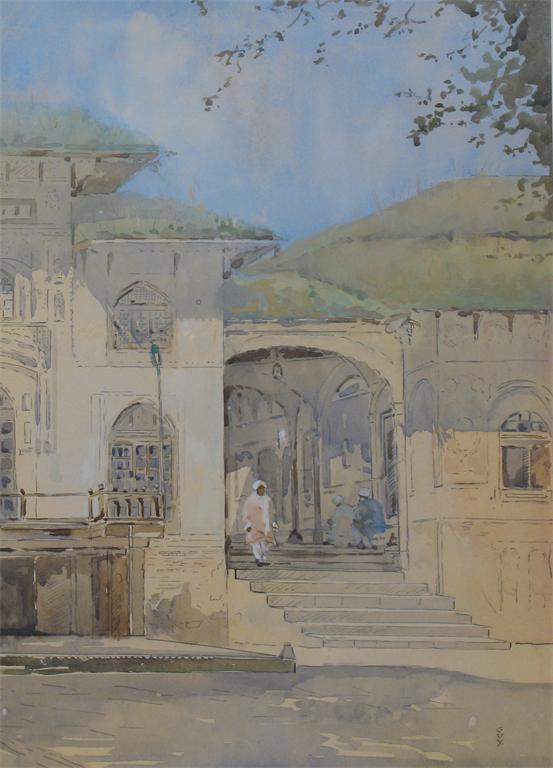 GUY (20th century): A market scene at Srinigar, signed, watercolour and gouache, 25 x 35cm (9.75 x 13.75in) and the companion, figures at the entrance to a building, 36.5 x 25.5cm (14.5 x 10in) (2)