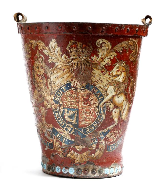 A 19th century red leather fire bucket, the body emblazoned with the Royal Coat of Arms (handle present but needs attaching), 33.3cm high, 29.5cm wide.