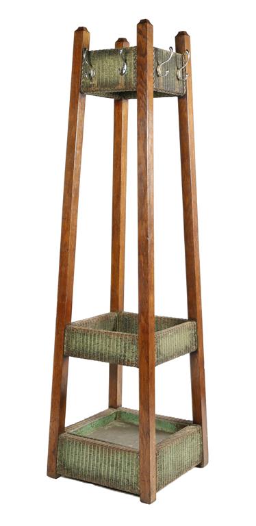 An Arts and Crafts style oak and loom hat stand, with eight hooks and a painted metal lift-out tray, early 20th century,186.2cm high, 50cm wide and deep.