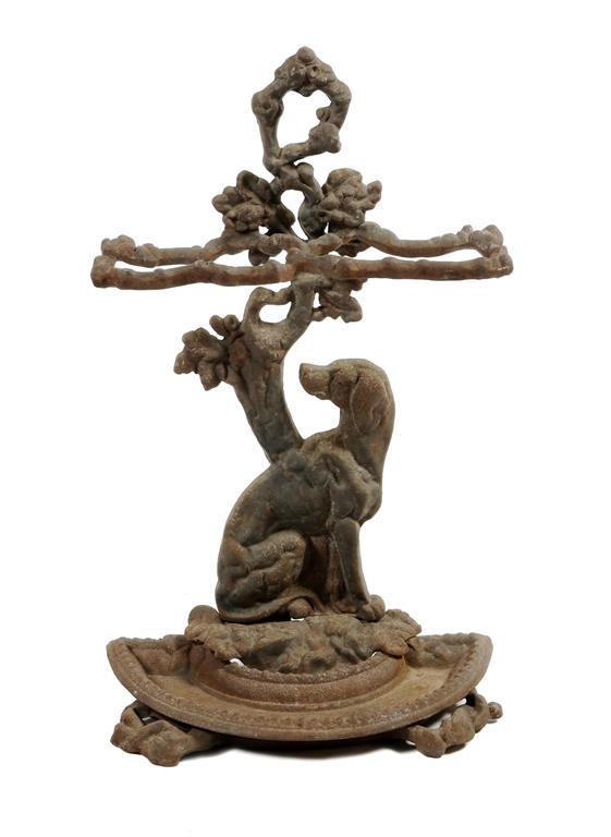 A Victorian cast iron stickstand, in the form of a seated dog before an oak tree, with two divisions and a lift-out tray, 69.2cm high, 44.9cm wide.